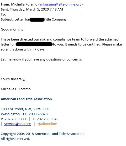 ALTA is alerting its members to delete a phishing email that includes an attachment letter that needs to be certified.
