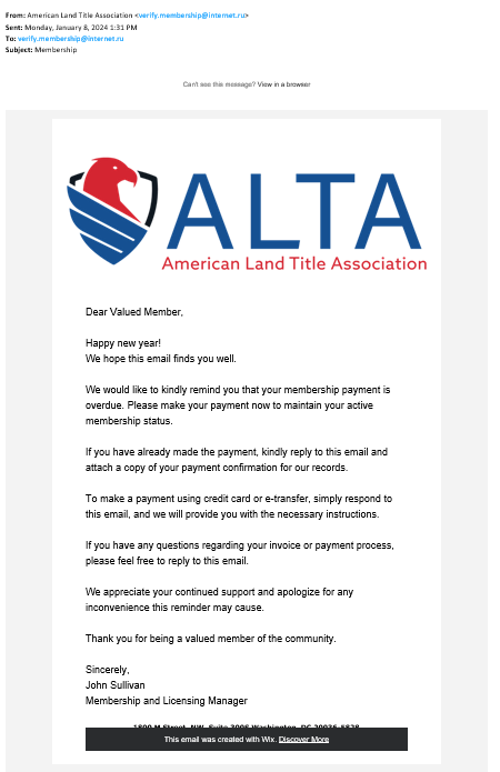 The email appears to come from Michelle Korsmo, ALTA’s former chief executive officer. Another red flag is that the email address is @alta-online.org. ALTA’s email domain is @alta.org.