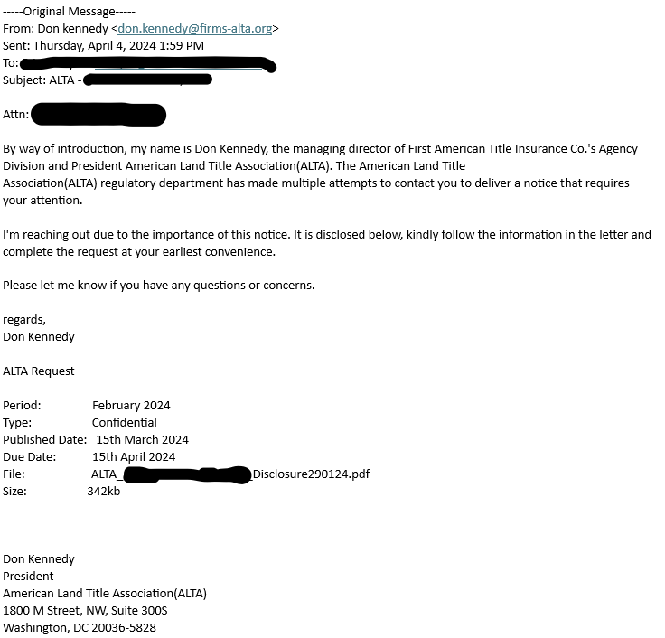 Like title and settlement companies, email from ALTA leadership and staff can be spoofed. In the latest scheme, a phishing email appears to come from ALTA President Don Kennedy telling recipients that ALTA's regulatory department has made multiple attempts to contact them to deliver a notice that requires attention. Note the fraudulent email address in the image. This is a phishing email. ALTA’s system was not breached. Your information is safe.