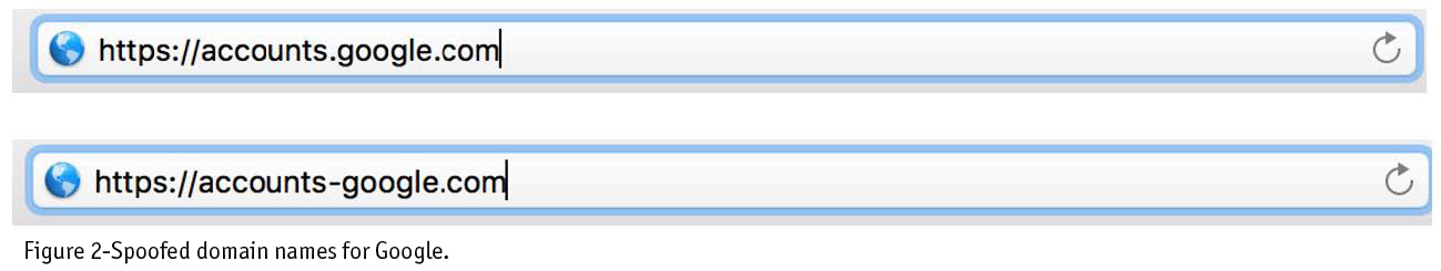 Google’s standard sign-in page is located at https://accounts.google.com. In this case, the hacker registered a similarly spelled domain – https://accounts-google.com. (Figure 2) Notice the subtle difference in the ‘.’ and ‘-’ after ‘https://accounts’. This minor change makes all the difference in cyberspace. Also, note the hacker’s use of the encrypted hypertext transfer protocol (HTTPS). HTTPS is a standard on the Internet to encrypt communication between parties like banks, retailers and their customers. The problem is that, while the communication between a server and the web browser may be encrypted, HTTPS does not ensure the veracity of the identity of the server. That is to say, just because the server appears to be related to Google, HTTPS does not ensure that it is.