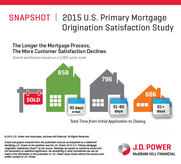 Mortgage customer satisfaction has increased this year as lenders have focused on developing functional digital channels and improving operational efficiency, according to J.D. Power’s 2015 U.S. Primary Mortgage Origination Satisfaction Study. Consumer satisfaction improves significantly when transactions close earlier than promised or when it was scheduled, the study found.