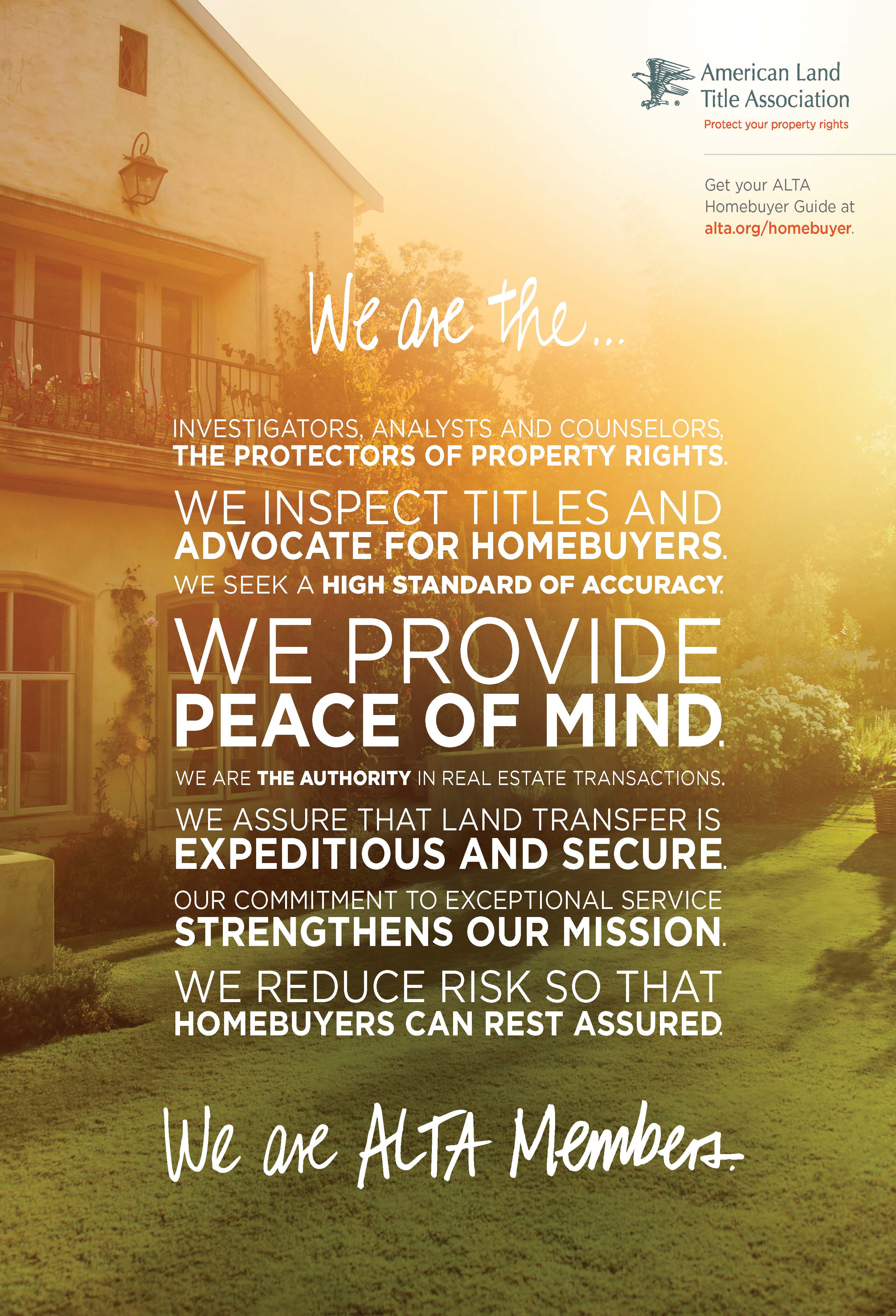 A popular item among ALTA members across the country is the ALTA Manifesto. The Manifesto in an inspirational piece highlighting many of the valuable services the industry performs to provide peace of mind to the consumer. This resource can be printed as a flyer or poster.