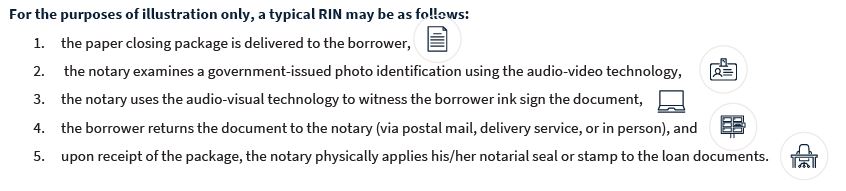 A RIN can be distinguished from a remote online notarization (RON) in which notarial documents are signed and tamper-sealed electronically, with the notarial seal applied electronically. Fannie Mae encourages the use of RON, but if not available to then consider RIN in jurisdictions that that recognize the availability of such notarization methods.