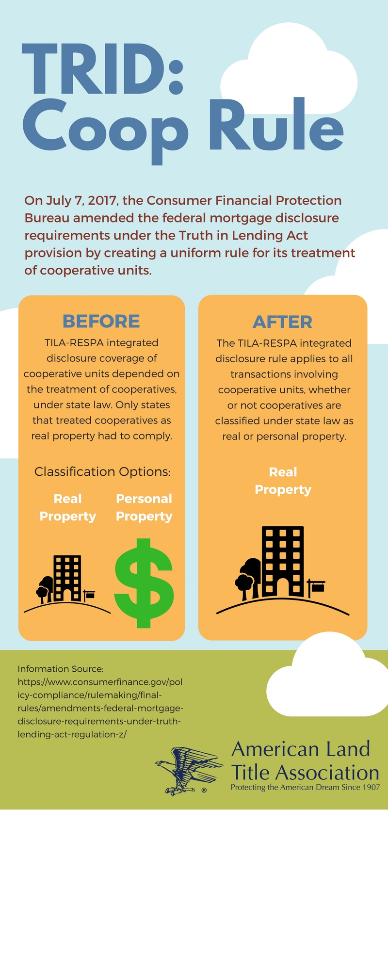 In July, the CFPB finalized a uniform rule regarding the application of the TILA-RESPA Integrated Disclosure (TRID) requirements for cooperative units.