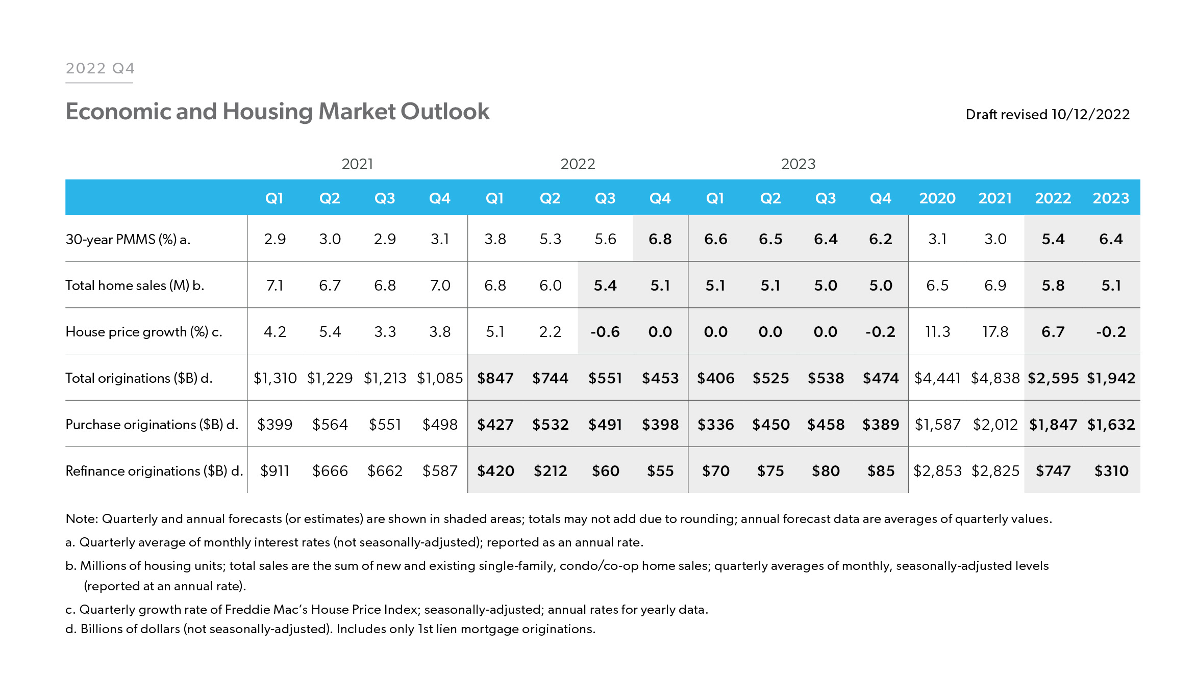 Given the house price and home sales forecast, Freddie Mac estimated home purchase mortgage originations to be $1.9 trillion in 2022, slowing to $1.6 trillion in 2023. With mortgage rates expected to remain elevated, refinance activity is estimated to slow with refinance originations declining from $2.8 trillion in 2021 to $747 billion in 2022 and $310 billion in 2023. Overall, Freddie Mac forecasts total originations to decline from the high of $4.8 trillion in 2021 to $2.6 trillion in 2022 and $1.9 trillion in 2023.
