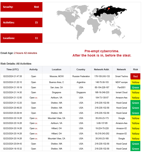 The title company’s emails were delivered to a U.S. server and then auto-forwarded and opened on mobile devices in Russia. This activity triggered high-risk alerts back to Aegis’ security team. A quick investigation revealed the title company was involved in a transaction with a fraudulent lender.