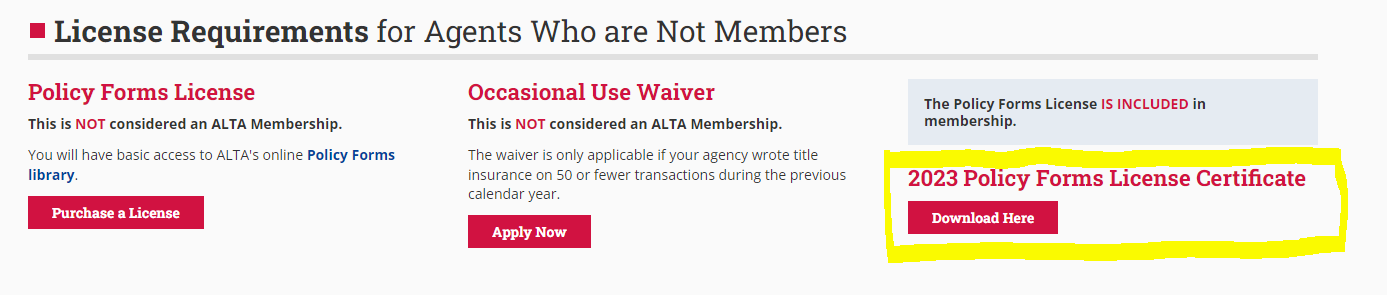 ALTA members and policy forms licensee holders can now download their licenses online. Once logged in, primary and secondary contacts can download certificates for their branch offices HERE.