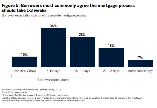 The survey showed three weeks is the upper limit of how long many consumers feel a mortgage transaction should take. Nearly three fourths said they think the process should take no more than 21 days from initiation of the application to closing, with 64% indicating one to three weeks is a sufficient amount of time, and 10% saying it should occur in even less time.