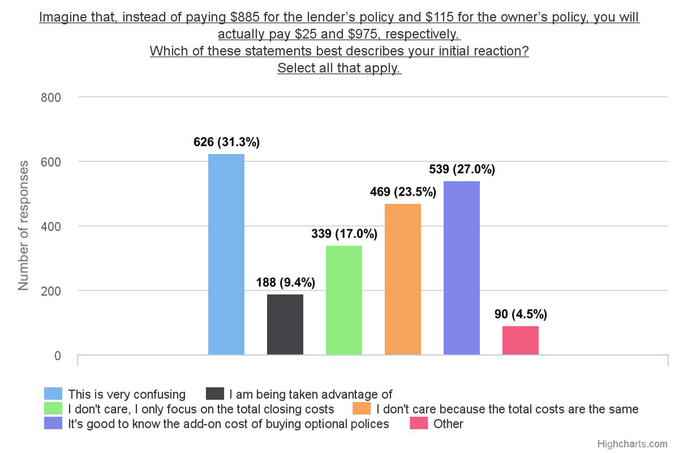 The data showed that a plurality of the people surveyed find the rule confusing and deceptive. After showing the CFPB’s disclosures and presented with the true cost of title insurance, the most popular response from consumers at 31 percent was “I’m confused.” While this confusion is disconcerting, it is not the most troubling finding from the survey. The most disconcerting data point is that 10 percent of consumers felt that they were being taken advantage of by not being told the true cost of title insurance on the disclosure.