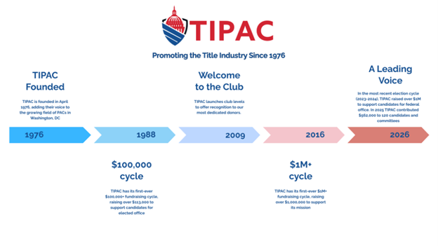 For 50 years, TIPAC has been the leading federal PAC for the title industry. We are excited to reach this remarkable milestone. Since our founding in 1976, TIPAC has contributed over $10 million (and counting) to hundreds of candidates and committees.