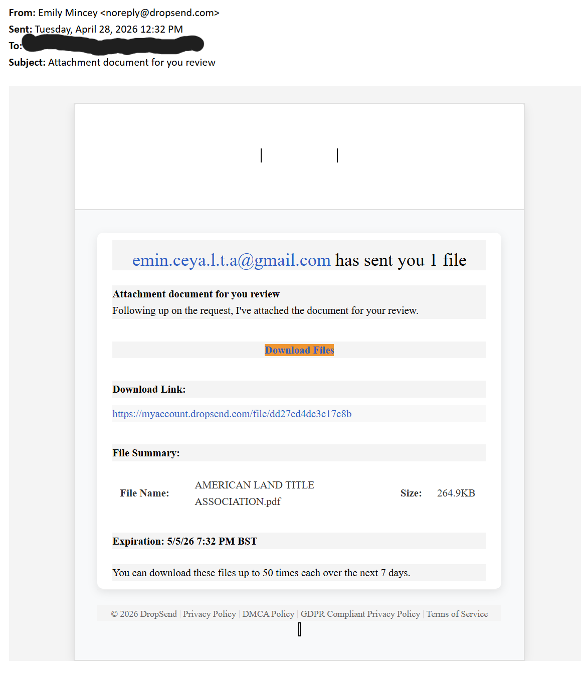ALTA is warning members about a phishing email circulating with the subject line “Your ALTA Membership.” The fraudulent message appears to come from ALTA, but the sender’s email address is not associated with ALTA. Email from ALTA on any topic will always come from the ALTA.org domain. The email has the subject line "Attachment document for you review."